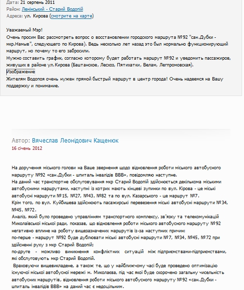 Однако в ответ на просьбу вернуть маршрут начальник управления транспортного комплекса, связи и телекоммуникаций Вячеслав Кащенюк сказал, что восстановление этого маршрута не целесообразно, потому как восстановление маршрута № 92 приведёт к дублированию городских автобусных маршрутов № 7, № 34, № 45, № 72 при осуществлении движения по мкр Старый Водопой. Поэтому, по словам Кащенюка, учитывая дублирование, а также то, что в ближайшем времени будет проведена оптимизация существующей городской автобусной сети г. Николаева, в ходе которой будет сокращено общую численность автобусных маршрутов, восстановление работы городского автобусного маршрута № 92 «сан.Дубки - госпиталь инвалидов ВОВ» на данный время нецелесообразно.