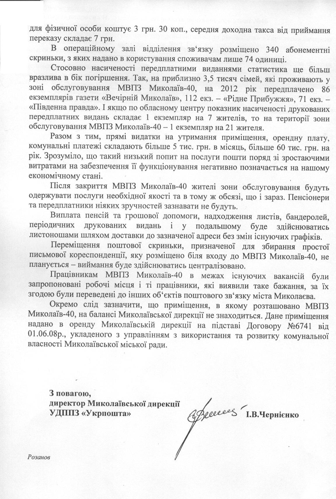 На днях на ситуацию с закрытием отделения отреагировали уже и в ОГА. Так, редакции "НикВести", информационная служба облгосадминистрации предоставила письмо директора Николаевской дирекции УГППС «Укрпочта» И.Черниенко в адрес главы облгосадминистрации Николая Круглова.