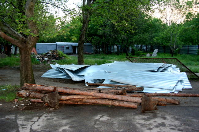 После того как забор был благополучно разобран люди аккуратно сложили листы профнастила (из которых был сооружен забор) и деревянные столбики к вагончику охраны стройплощадки, как бы символизируя, что «чужого им не нужно». Напоследок люди «с корнем» вывернули большинство деревянных столбов, на которых крепилось ограждение.