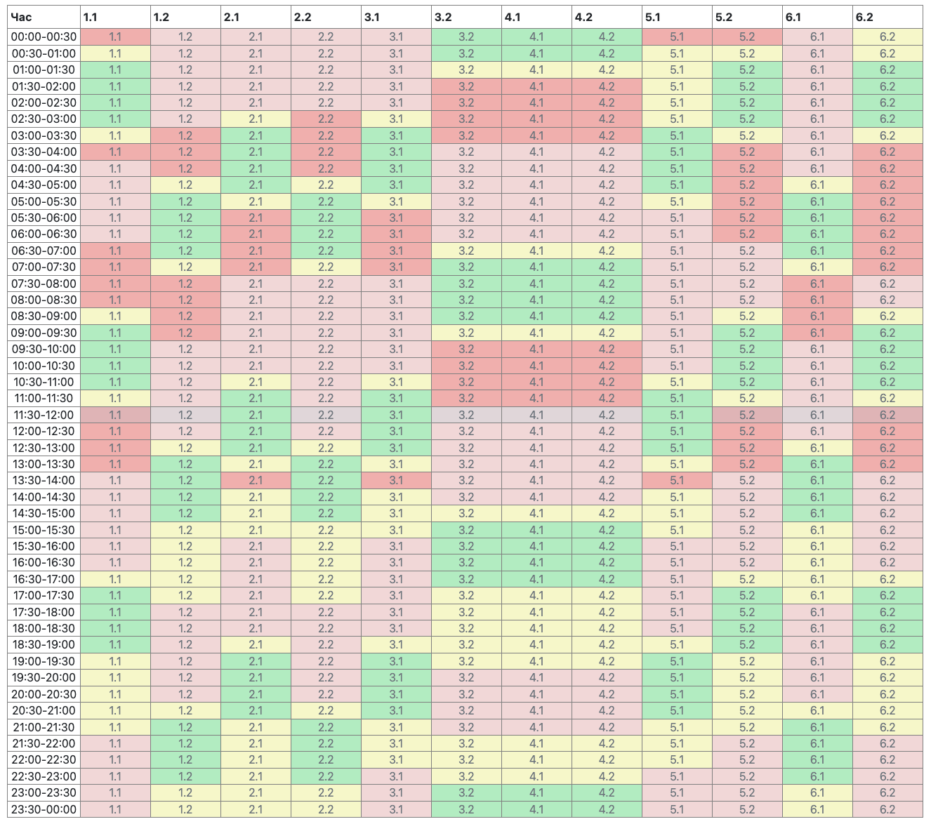 1.1 – 00:00 – 01:00; 03:00 – 09:00; 11:00 – 17:00; 19:00 – 00:00