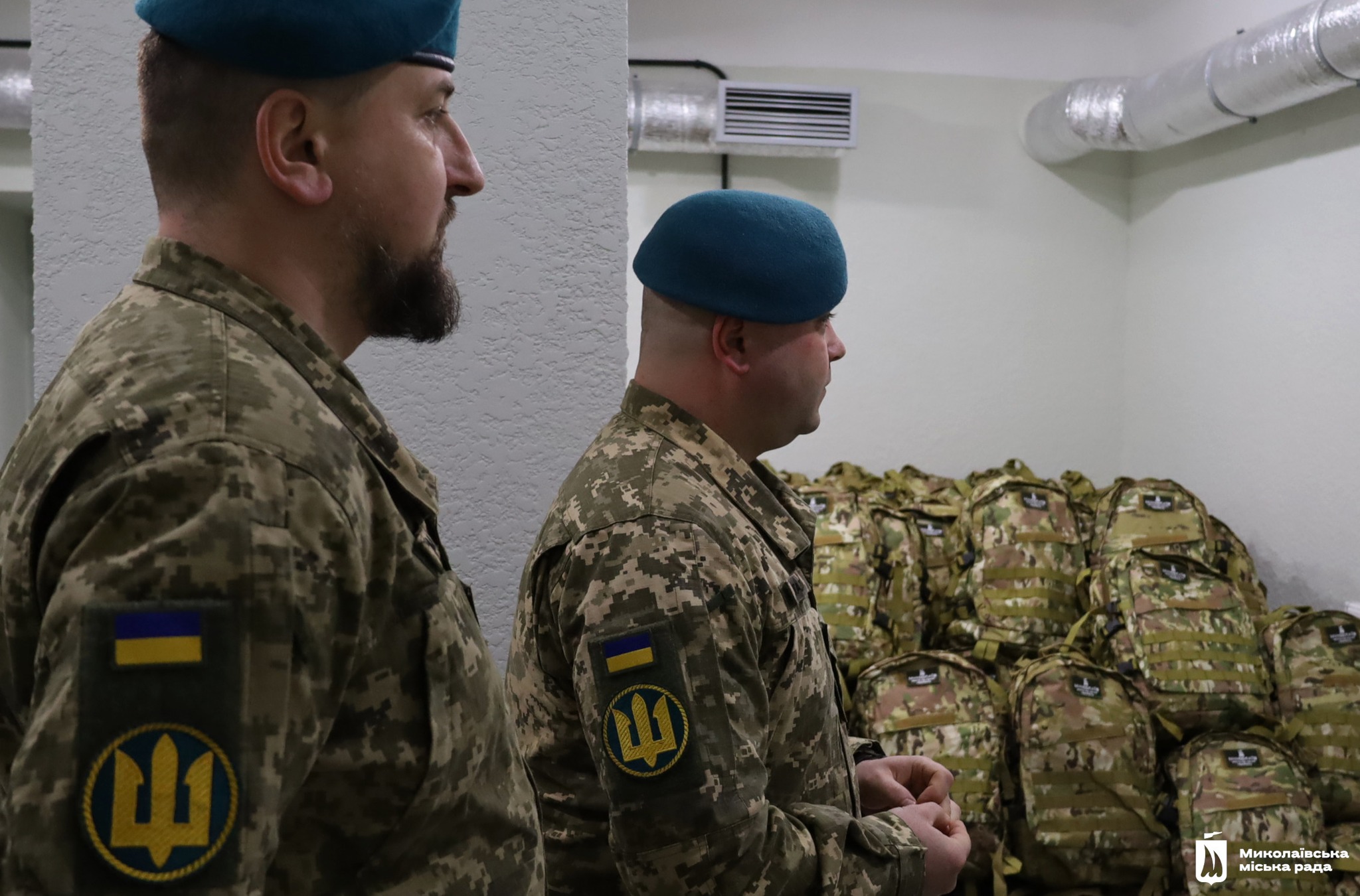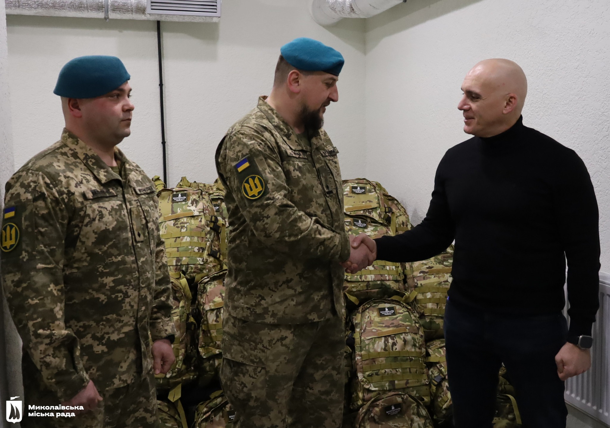 Мер Миколаєва Олександр Сєнкевич передав морпіхам рюкзаки з речами першої необхідності. Фото: Миколаївська міська радаМіський голова Миколаєва Олександр Сєнкевич передав 45 рюкзаків морським піхотинцям, яких звільнили з російського полону 5 лютого.