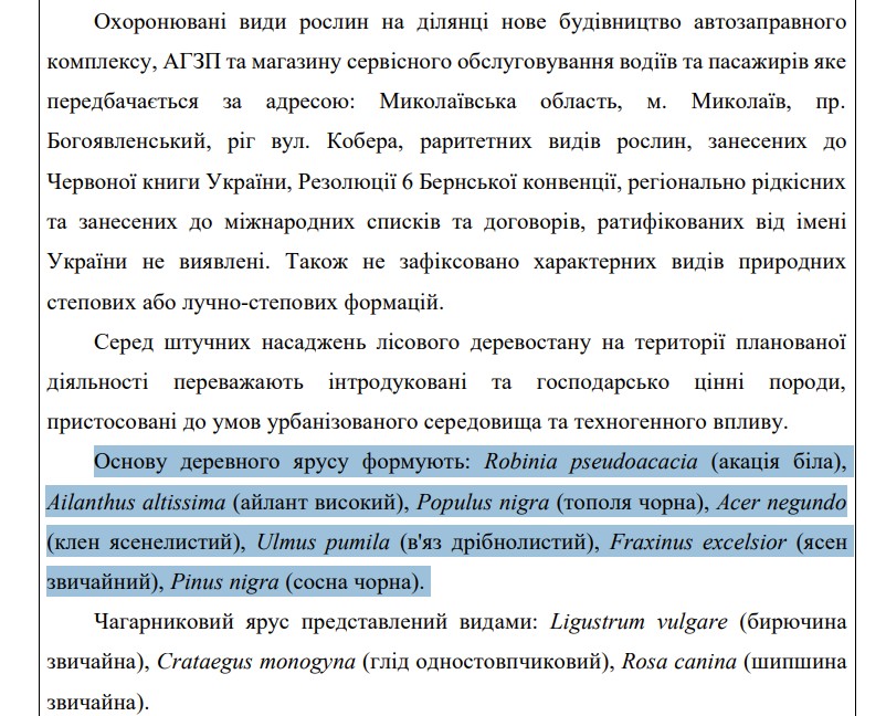 Скриншот із науково-дослідної роботи Польові дослідження щодо впливу на біологічне різноманіття, природні оселища, рідкісні та зникаючі види флори і фауни від планованої діяльності «Нове будівництво автозаправного комплексу, АГЗП та магазину сервісного обслуговування водіїв та пасажирівКрім того, у звіті вказано, що на ділянці не виявили природних оселищ, які охороняються Бернською конвенцією, а також рослинних угруповань, занесених до Зеленої книги України.