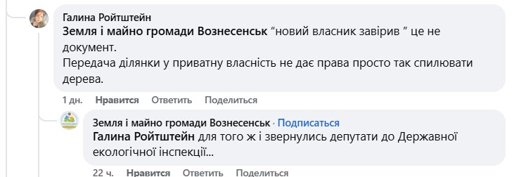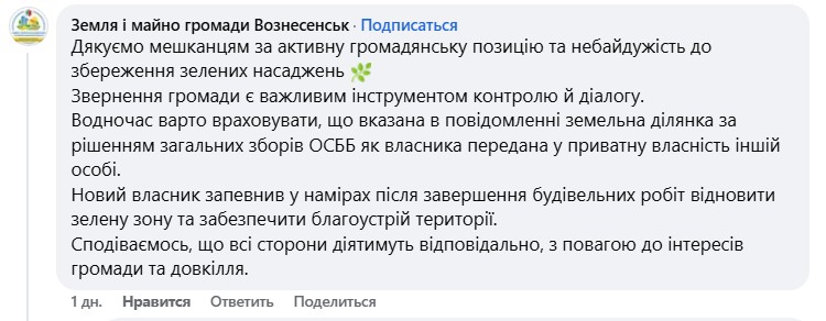 У Вознесенську біля багатоповерхівки спиляли всі дерева. Фото: Facebook-сторінка Вознесенськ - місто мріїВодночас у коментарях під дописом представники відділу земельних відносин Вознесенської міської ради повідомили, що земельна ділянка, про яку йдеться, за рішенням загальних зборів ОСББ як власника була передана у приватну власність. Новий власник, за їх словами, запевнив, що після завершення будівельних робіт планує відновити зелену зону та здійснити благоустрій території.