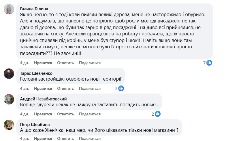 У соцмережі Facebook жителі міста повідомили, що невідомі зрубали дерева біля будинку. Люди називають те, що сталося, «варварством» та «злочином», обурюються, що насадження спиляли під корінь, хоча їх, на думку частини мешканців, можна було пересадити.