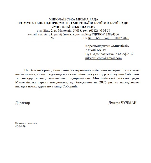 «Щодо видалення аварійних та сухих дерев по вулиці Соборній та висадці нових, комунальне підприємство «Миколаївської міської ради Миколаївські парки» повідомляє, що бюджетом на 2026 рік не передбачено висадка нових дерев по вулиці Соборній», — йдеться у відповіді підприємства.