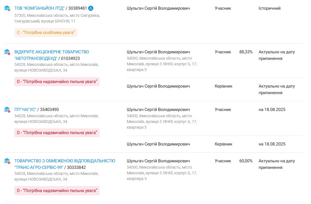Сергій Шульгач – депутат Миколаївської обласної ради від «Пропозиції». Також він неодноразово був депутатом Миколаївської міської ради. Також за даними YouControl, Сергій Шульгач керівник ще ряду компаній компанії, які неодноразово вигравали тендери на ремонт та утримання доріг.