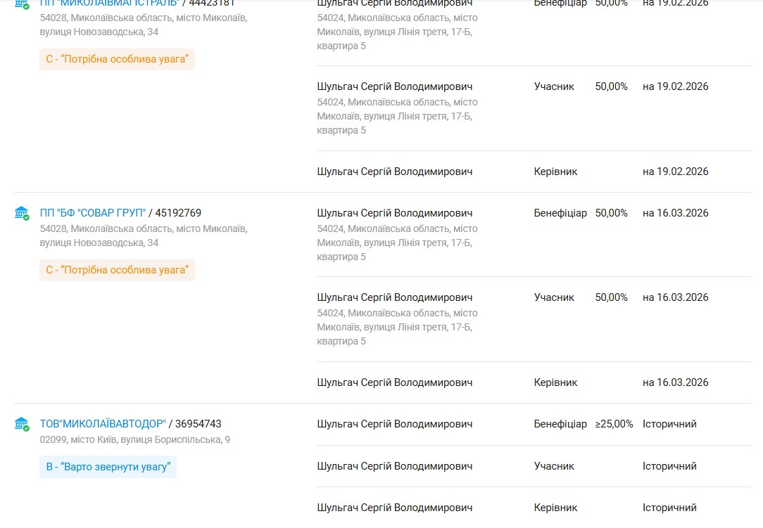 Зазначимо, що у січні «Миколаївводоканал» також шукав підрядника для ремонту доріг після ремонтів. Переможцем обрали приватне підприємство «БФ «Совар груп». Згідно з даними платформи YouControl підприємство зареєстровано в серпні 2023 року. Власниками «БФ «Совар груп» є Шульгач Сергій Володимирович та Шульгач Оксана Іванівна.