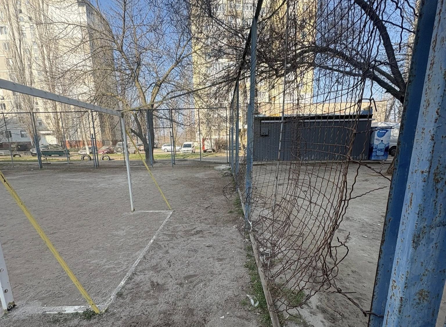 Юлія Позднякова попросила привести до ладу дитячий майданчик та футбольне поле у дворі по вул. Лазурній біля будинків 10-А та 6-В. Жителька Миколаєва називає їхній стан небезпечним.