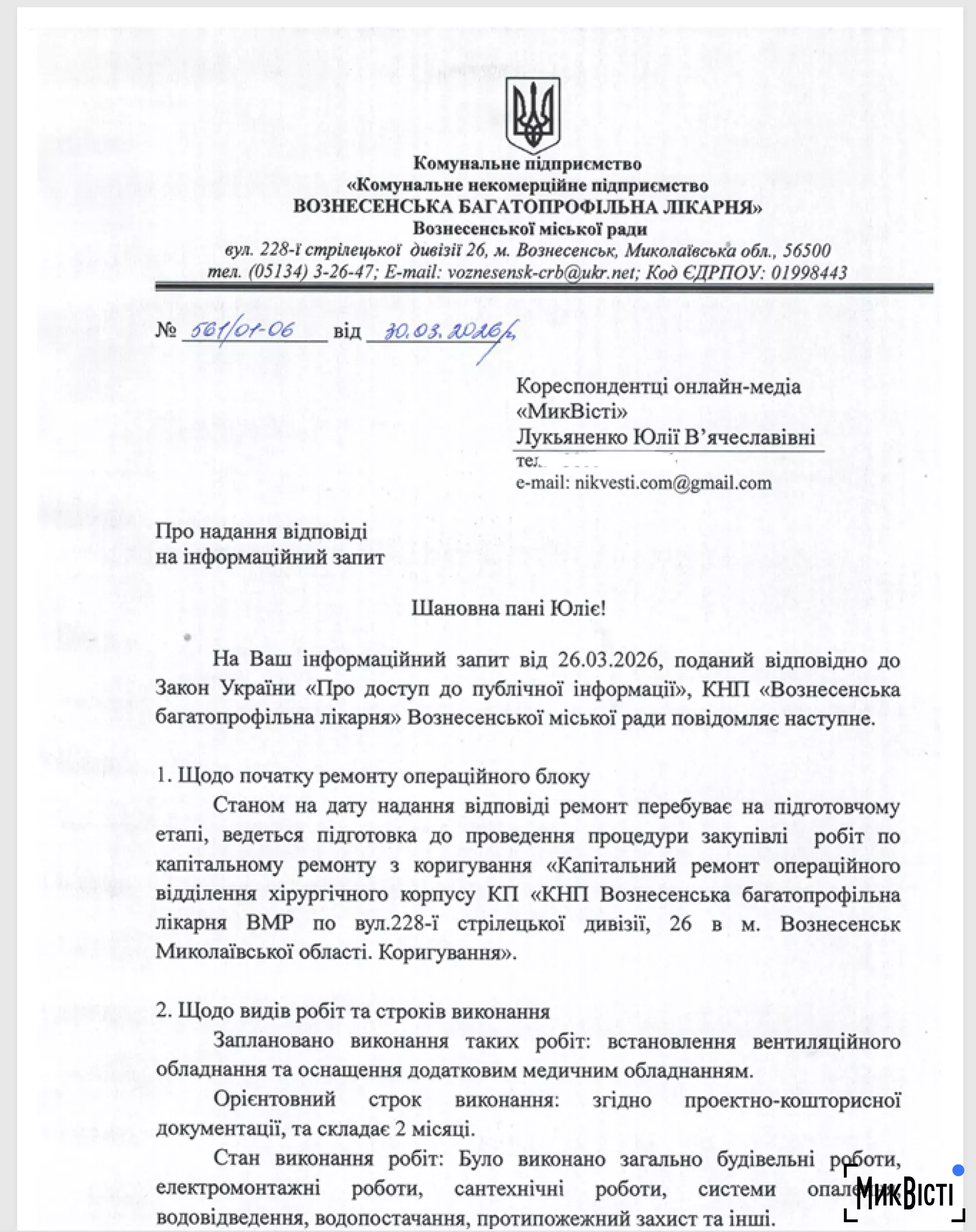Про повідомили у Вознесенській багатопрофільній лікарні у відповіді на запит «МикВісті».