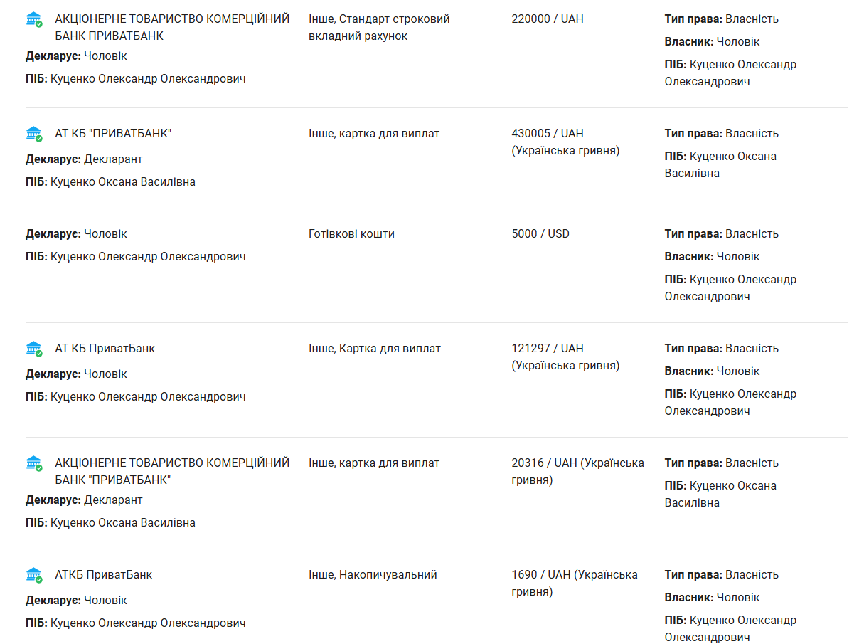 Крім того, вона задекларувала 50 тисяч доларів готівкою, понад 450 тисяч гривень на банківських рахунках, а також майже шість тисяч гривень доходу від оренди. У власності родини — дві квартири та земельна ділянка.