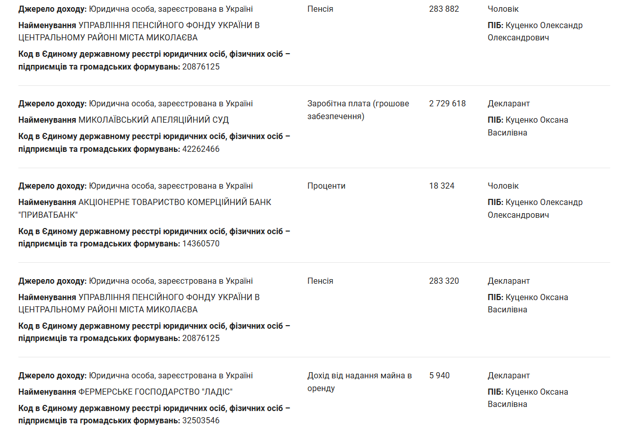 Згідно з декларацією, у 2025 році Оксана Куценко отримала майже 2,8 мільйони гривень заробітної плати та понад 283 тисяч гривень пенсії, пишуть «МикВісті».