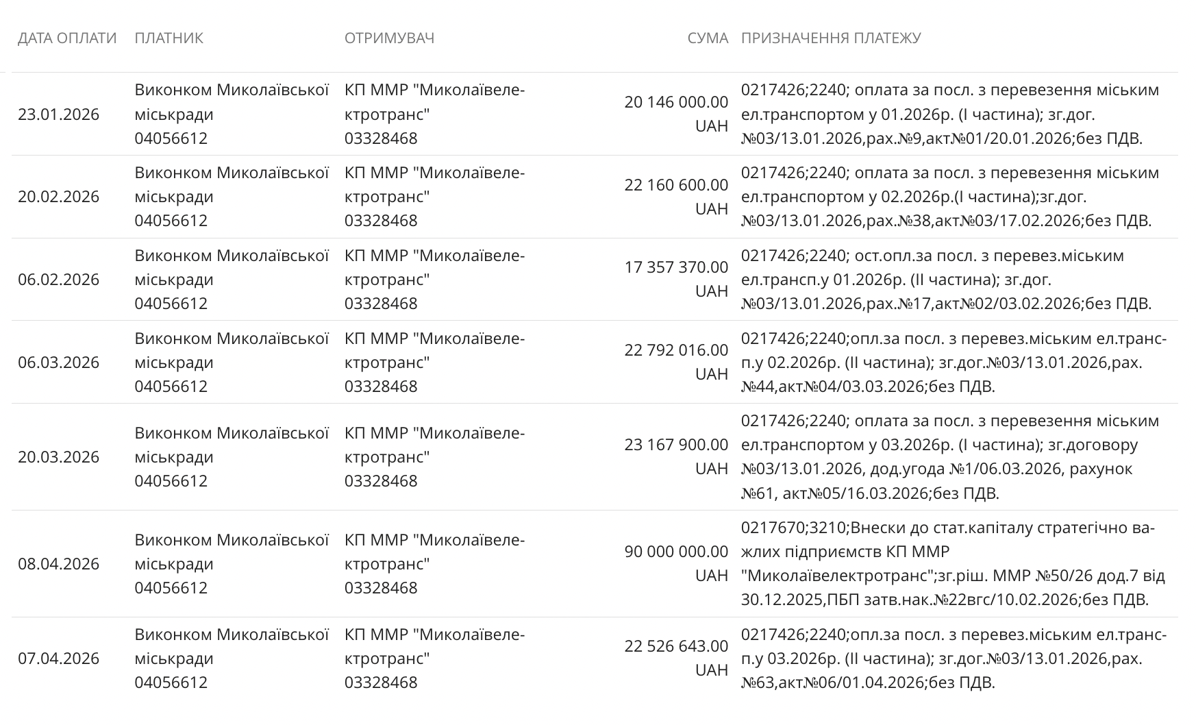 Від початку року виконком перерахував «Миколаївелектротрансу» 128,1 мільйона гривень, скриншот з сайту Spending.gov.uaВарто зазначити, що «Миколаївелектротранс» одне з комунальних підприємств міста, які отримали найбільше внесків у статутний капітал за останні два роки. Для «Миколаївелектротрансу» ця сума склала 212 мільйонів гривень. Детальніше про це читайте у статті «МикВісті» «Миколаїв за два роки вклав 1,7 млрд грн у комунальні підприємства: куди пішли гроші».