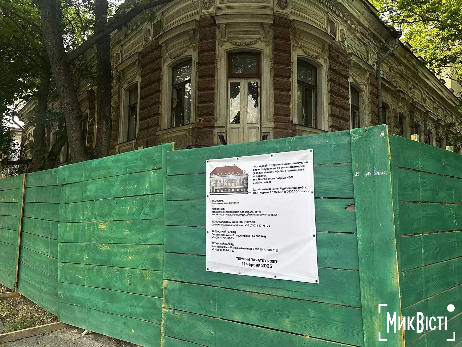 Як відомо, у Миколаєві рік тому почались роботи з реставрації історичної будівлі 19 сторіччя — пам’ятки архітектури, відомої як «Дім Юріцина». Територію навколо маєтку огородили парканом, а будівельники, зокрема, збили частину декоративної ліпнини на фасаді, як виявилось, ще до отримання дозволу на роботи. Мова про двоповерховий будинок, який знаходиться з адресою вулиця Вадима Благовісного (Нікольська) 40/1, на перетині з вулицею Олексія Вадатурського (Фалєєвська). Будівля належить приватному власнику — у 2023 році її придбала Ірина Герасименко.