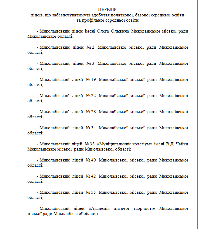 Начальниця управління освіти також пояснила, що за рішенням засновника у ліцеї можуть бути середні класи та, як виняток, початкові. Оскільки у Миколаєві будівлі ліцеїв великі та деякі можуть вміщати більше тисяч учнів, то утримувати їх напівзайнятими лише ліцеями невиправдано економічно.