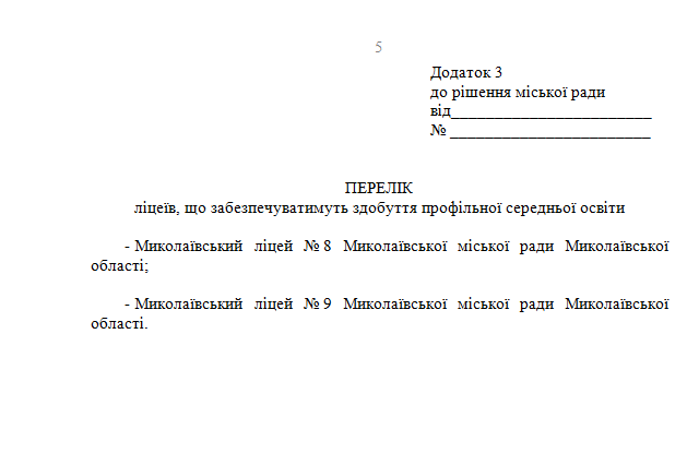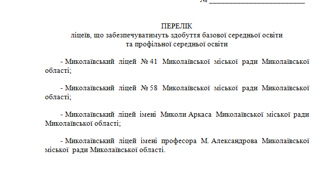 У проєкті рішення, який депутати мають розглянути на засіданні Миколаївської міськради, йдеться про академічне спрямування, тобто орієнтацію учнів на продовження навчання на вищих рівнях освіти. Як пояснила Ганна Личко, щоб ліцей отримував фінансування з держбюджету, у паралелі має бути не менше двох старших класів за трьома профілями.