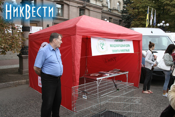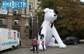 Сегодня, 4 октября, в День защиты животных под зданием Николаевского горсовета прошла акция, посвященная проекту "4 лапы" ("Four paws"). Акция призвана популяризировать гуманное решение проблемы бродячих животных в Николаеве. Защитники животных установили палатку с соответствующей литературой и символикой, поставили рядом клетку и надули огромную резиновую собаку.