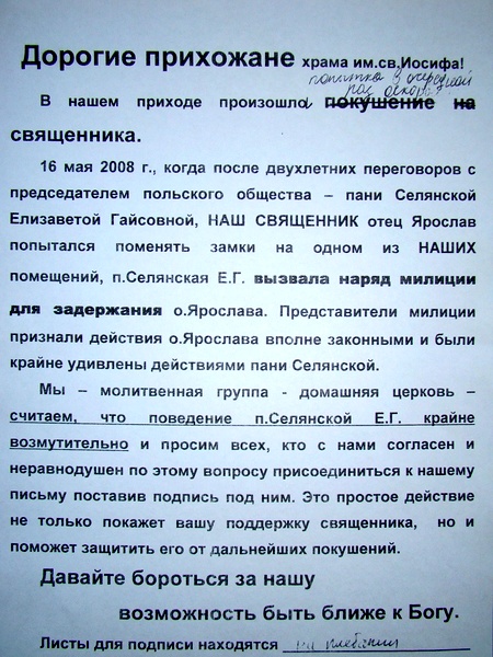- Нет. Я просто рассказываю историю, как это было. Это была раньше устная договоренность, о которой говорит Юрий Кораб. Когда меня избрали председателем, я развела очень бурную деятельность по этому вопросу. Я рассчитывала на то, что все-таки священники – это люди высокоморальные, которые держат свое слово, если есть какие-то проблемы, они стараются решить их. Поэтому у меня даже не возникало мысли о том, что нас просто так выбросят, будут сверлить замки. Сверление замков – это были крайние методы. До этого меняли замки, отключали свет, причем это всегда происходило перед каким-то мероприятием. И я эти вопросы должна была урегулировать через епископа, через консула. Я звонила туда, говорила, что нам отключили свет и поменяли замки.