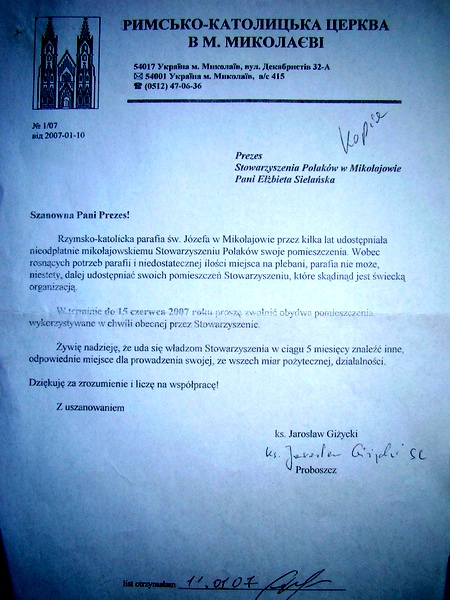 Мы уже писали о конфликте областного общества поляков, главой которого является Елизавета Селянская, с костелом. Четыре года назад, став во второй раз настоятелем римо-католической церкви в Николаеве, отец Ярослав Гижицкий начал активно пытаться отделить общество поляков как светскую организацию от костела. Спустя год Елизавета Селянская подняла этот вопрос в узком кругу католиков, но ситуация еще больше обострилась. Ярослав Гижицкий не хотел, чтобы поляки занимали помещение, в котором сейчас находится краеведческий музей и которое согласно документам принадлежит костелу.