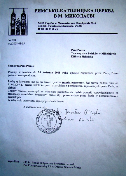 В Николаев приезжали высокие церковные власти из Польши. Три дня они вели переговоры со мной и отцом Ярославом. Они не хотели, чтобы общество поляков переезжало, уговаривали остаться (к этому времени мы уже нашли помещение для общества с помощью мэра Чайки). Меня они уговорили, я была согласна пойти на любые уступки, любые переговоры. Но отца Ярослава они не уговорили.