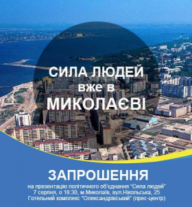 В среду, 7 августа, в 18:30 в Николаеве, в отельном комплексе "Александровский" по адресу Никольская, 25, состоится презентация создания объединения «Сила людей», на которую приглашаются все заинтересованные и активные люди.