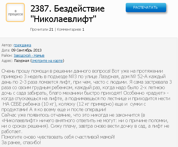 - Я сама застревала 3 раза со своим грудным ребенком, каждый раз, когда надо было 2-х летнюю дочь с сада забирать, благо механики быстро приходят. Особенно «радует» - когда спускаешься на лифте, а поднимаешься по лестнице и приходится нести на себе ребенка (10 кг), коляску (12 кг примерно) еще и сумки с продуктами. А я ко всему еще и после операции,- написала в обращении к властям жительница Николаева.