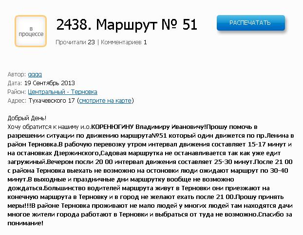 В своем письме он просит принять меры, так как в районе Терновка проживает немало людей, у многих людей там находятся дачи, многие жители города работают в Терновке.