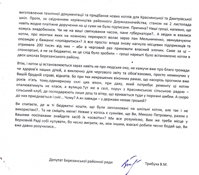 Об этом идет речь в письме главы Березанской райорганизации партии ВО "Батьківщина" Владимира Трибухи к председателю Николаевской ОГА Николаю Круглову.