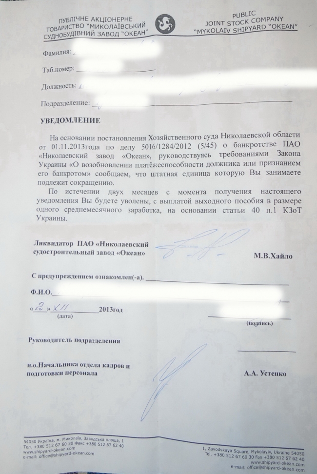 - На основании постановления Хозяйственного суда Николаевской области от 01.11.2013 года по делу 5016/1284/2012 (5/45) о банкротстве ПАО «Николаевский завод «Океан», руководствуясь требованиями Закона Украины «О возобновлении платежеспособности должника или признанием его банкротом» сообщаем, что штатная единица, которую Вы занимаете, подлежит сокращению, - говорится в каждом обращении.