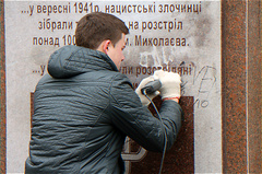 Как говорится в сообщении, в Николаеве в очередной раз очищают памятник жертвам Холокоста от «грязных» надписей.