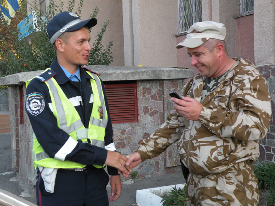 В течение месяца 15 инспекторов ГАИ Николаевской области мужественно несли службу на востоке страны и оказывали необходимую помощь местным жителям. После смены своими коллегами правоохранители вернулись домой живые и здоровые, где их во дворе Управления ГАИ области под аплодисменты встречали родственники, сослуживцы, начальник УМВД Украины в Николаевской области Виталий Гончаров и исполнитель обязанностей заместителя начальника УГАИ Александр Ермолинский.