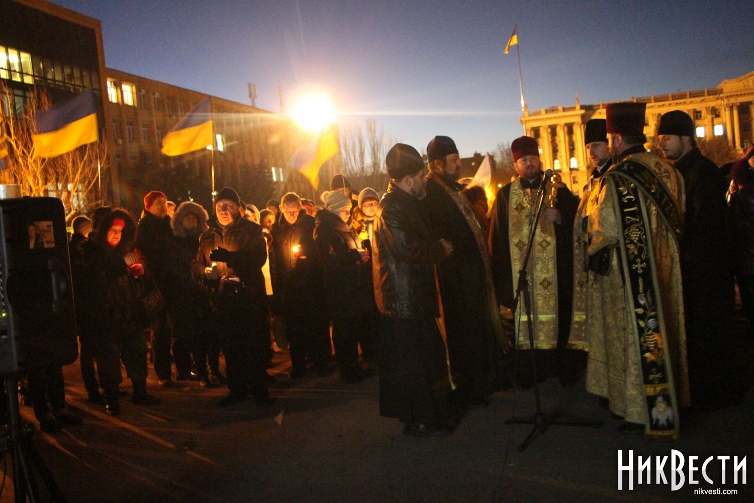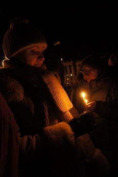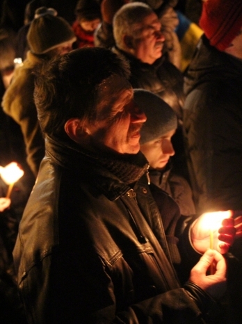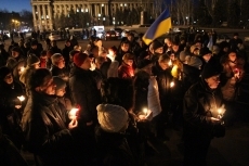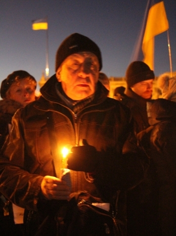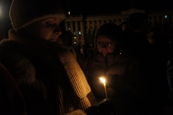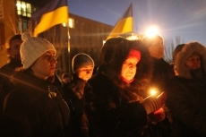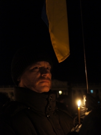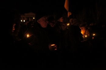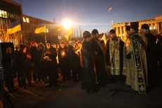 Сегодня, 18 февраля, около ста николаевцев собрались на главной площади города, чтобы вместе со служителями церкви провести панихиду по погибшим на улицах Киева год назад.