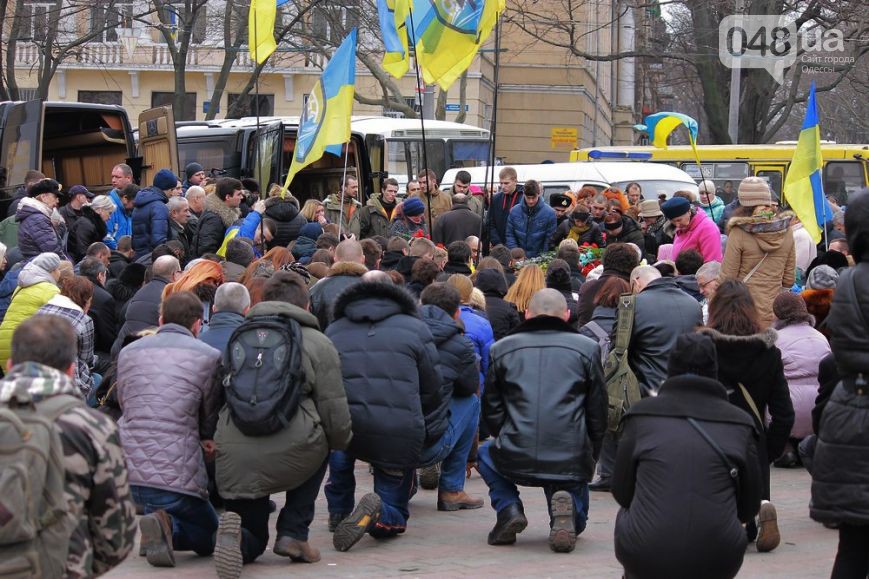 Во время траурной церемонии одесситы стали на колени. Также люди скандировали «Герои не умирают» и «Героям слава». Представителей власти на прощании не было. Ранее с побратимами попрощался полк «Азов».