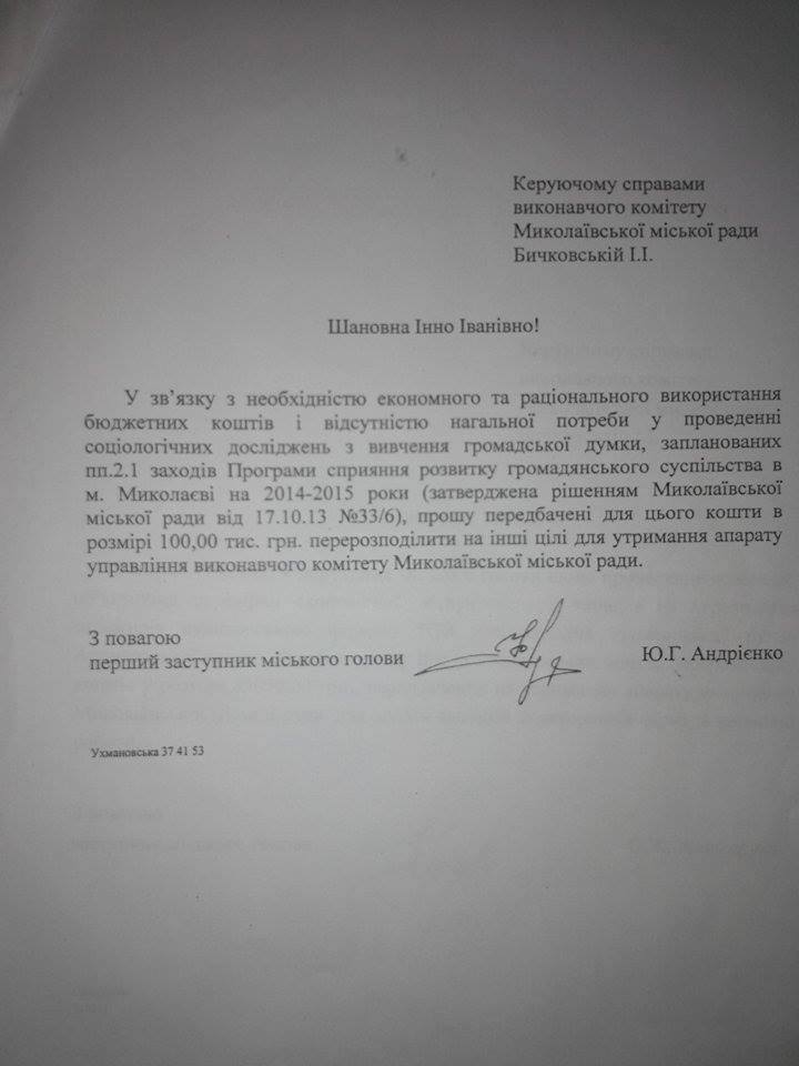 Представителям «Демальянса» показалось интересным, что в документе, который им показали, первый заместитель городского головы Юрий Андриенко обращается к управляющей по делам исполнительного комитета Николаевского городского совета Инне Бычковской и просит перераспределить денежные средства, не указана дата.