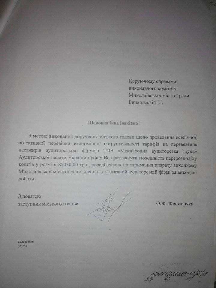 Также на еще один запрос был получен документ, где тогдашний заместитель городского головы Александр Женжеруха обращается к управляющей делами исполнительного комитета Николаевского городского совета Инне Бычковской с просьбой рассмотреть возможность перераспределить средства в размере 85030,00 гривен, предусмотренные на содержание аппарата исполкома городского совета, на оплату услуг аудиторской фирмы ООО «Международная аудиторская группа» Аудиторской палаты Украины. Опять же документ без указания даты.