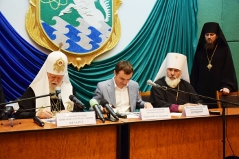 Руководитель области напомнил, что в прошлый приезд Патриарха в селе Мешково-Погорелово Жовтневого района был заложен первый камень под строительство православной церкви Рождества Христова, а также освящены крест и место под новую церковь.