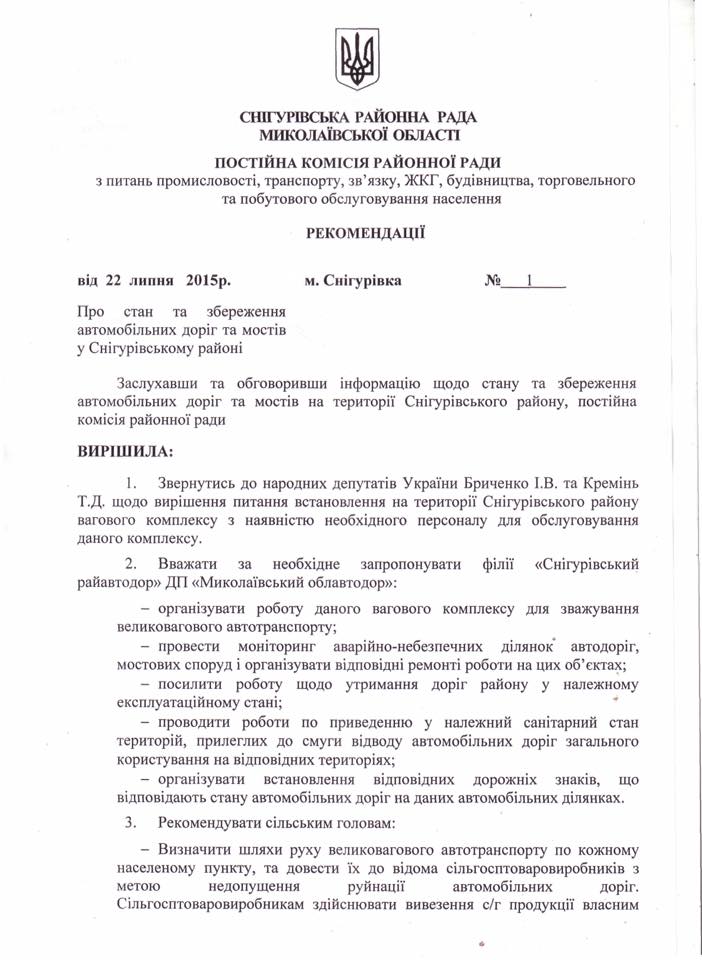 По результатам чрезвычайных ситуаций, произошедших в результате разрушения грузовиками понтонных мостов и дорог местного значения, на Снигиревщини народные депутаты Тарас Креминь и Игорь Бриченко встретились с представителями местной власти: руководителями райгосадминистрации, районного совета, с прокурором района, начальником райотдела милиции, сельхозпроизводителями, сельскими головами, общественностью.