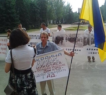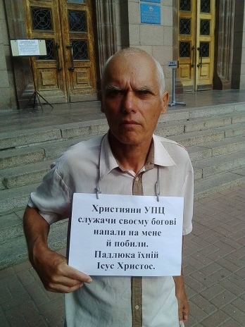 Среди протестующих известный николаевский монопикетчик Анатолий Ильченко, который пришел напомнить об инциденте, произошедшем с ним год назад. По словам Ильченко, его избила группа представителей Украинской православной церкви.