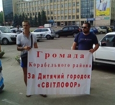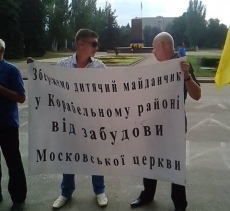 Вторая группа пикетчиков требует не уничтожать детский городок в Корабельном районе и не не допустить строительство храма Украинской православной церкви Московского патриархата по адресу проспект Октябрьский, 328/3 возле территории бывшего детского городка «Светофор».