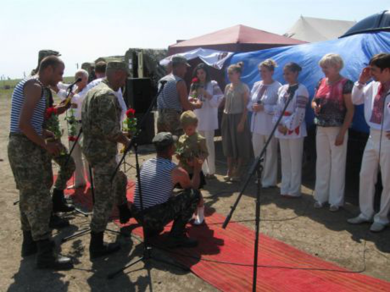 С особой искренностью присутствующие реагировали на каждую песню и тепло восприняли «Катюшу» в исполнении маленькой талантливой Марьи Слободниченко. Но особой для военнослужащих стала авторская песня Анатолия Федорова «Защищай Украину». Даже в полевых условиях бойцы нашли возможность отблагодарить артистов благоухающими розами и сладостями.