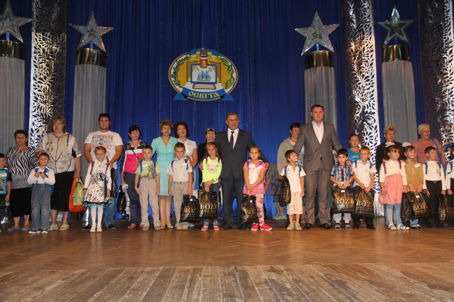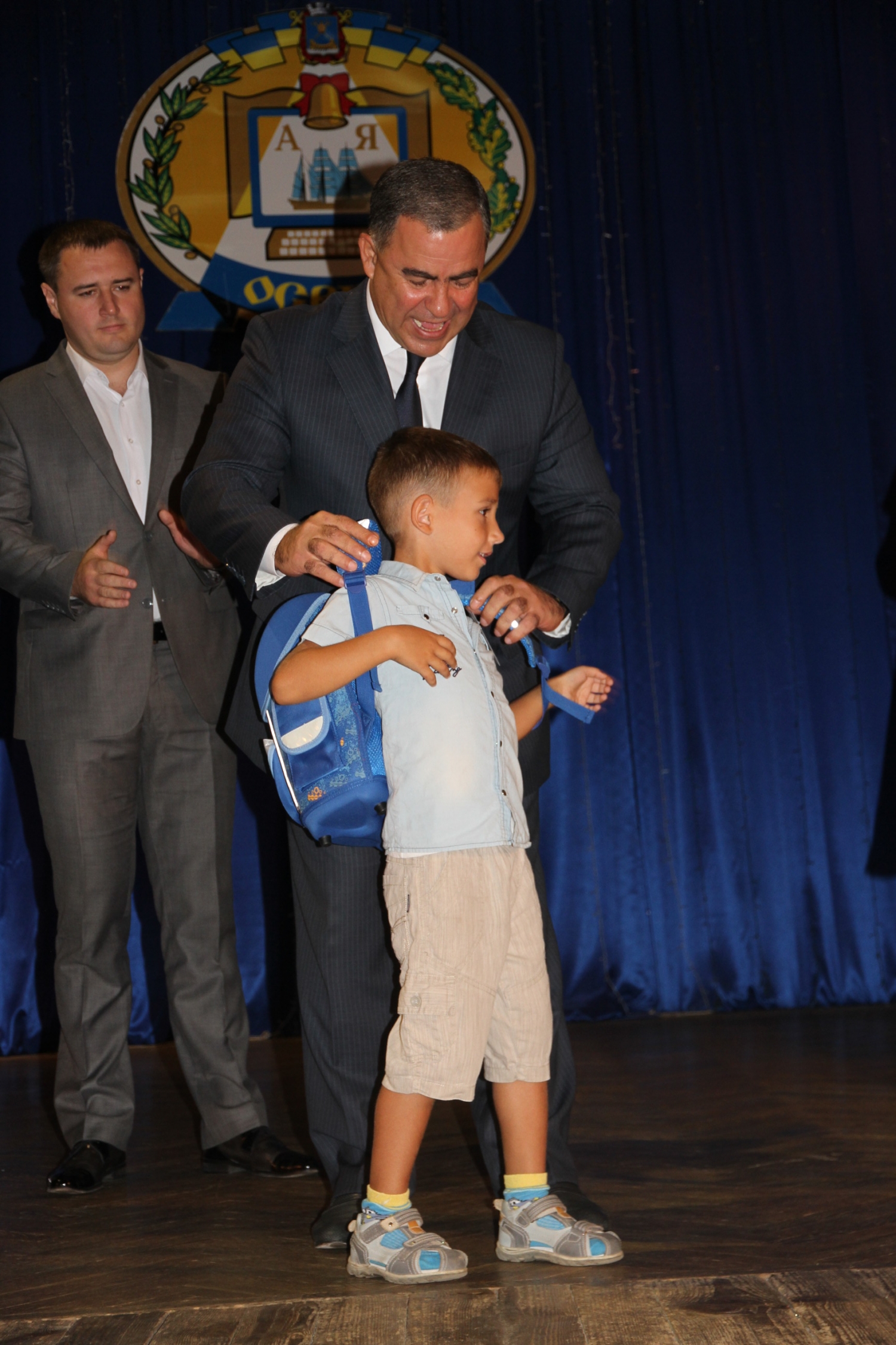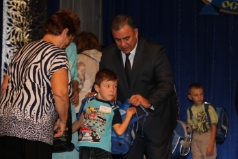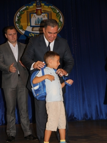 Мэр Николаева Юрий Гранатуров, его заместитель Евгений Шевченко, начальник управления образования Анна Деркач вручили 26 первоклашкам, которые нуждаются в особом внимании, школьную и спортивную формы, а также портфели.