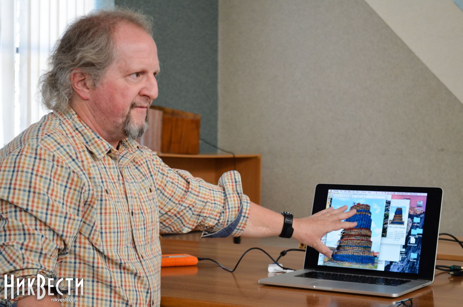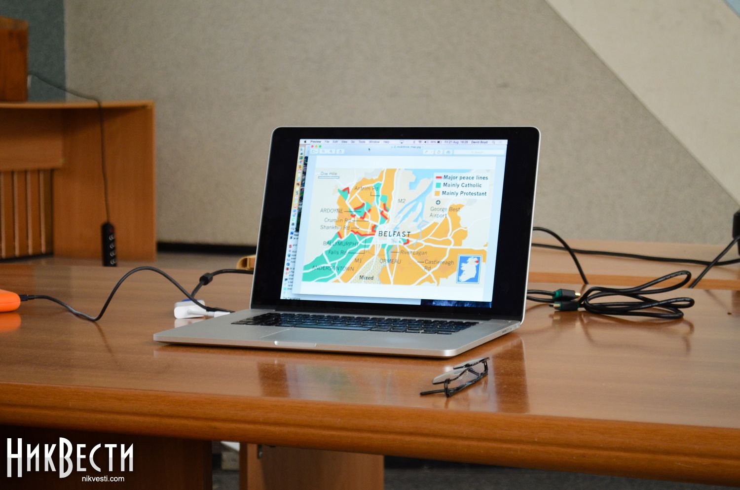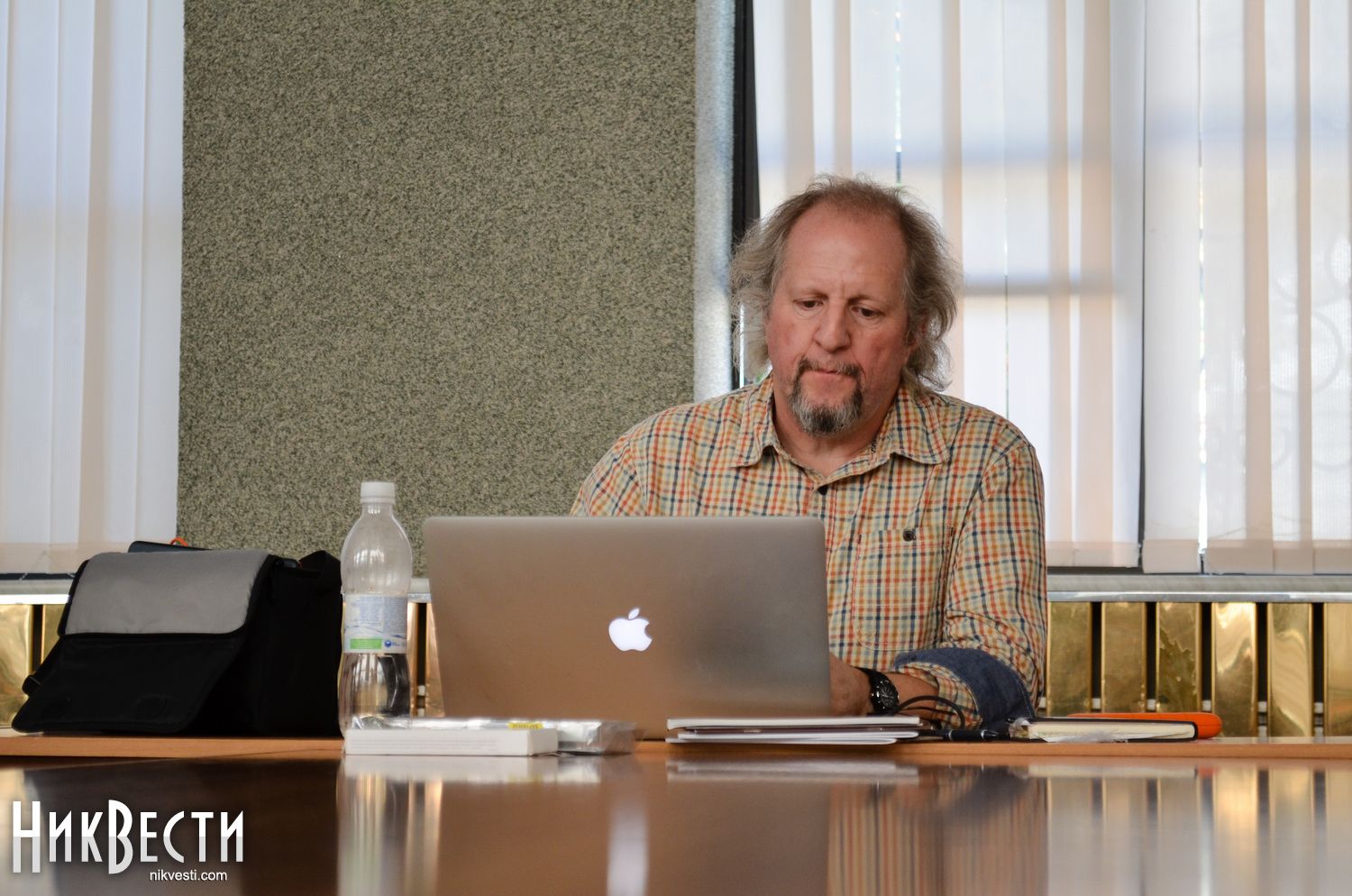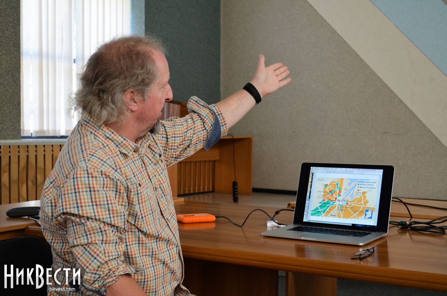 В Николаев Дэвид Бойд приехал, чтобы поговорить о роли культуры и искусства в индустриальном городе, который разделен на два непримиримых лагеря. Презентация проходила на английском языке с переводом на русский.