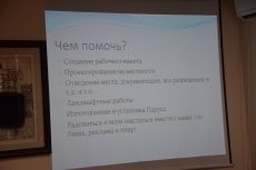 Мария Пахомова напомнила, что в этом году они представили свою идею в конкурсе от «Нескафе». Однако занятое 5-е место не позволило выиграть средства для реализации «Поющего паруса». Несмотря на это активисты верят, что проект стоит того, чтобы сражаться за его воплощение, и в будущем может принести ощутимые дивиденды.