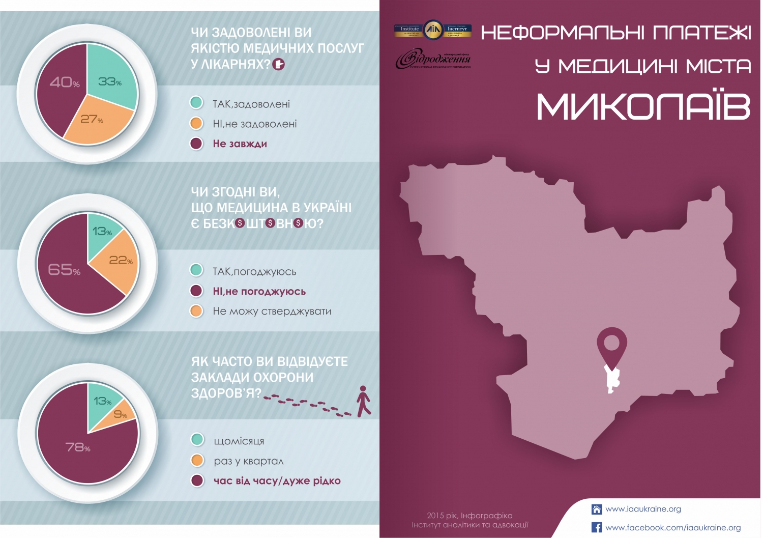 Николаевцы вынуждены платить в «благотворительные» фонды (они же — больничные кассы). Из опрошенных посетителей больниц почти половина (49%) «оставили» в больнице до 1000 гривен в год, еще 13% — от 1000 до 2000, примерно столько же — до 4000 гривен, и еще четверть опрошенных — более 5000 в год. Более половины опрошенных в ходе последнего визита в больницу потратили там 50 гривен, а 10% — от 200 до 500 гривен.