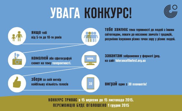 В рамках кинофестиваля «Единство и толерантность» с 15 сентября по 15 ноября проходит конкурс детских рисунков и фотографий. Его цель – начать диалог о терпимости к людям с иным мировоззрением, об уважении непохожих обычаев и традиций, признании альтернативных точек зрения. Участие в конкурсе могут принять дети и подростки от 5 до 18 лет. Условия участия – на сайте tolerancefilmfest.org.ua. Победителей в трех возрастных группах определит открытое голосование. Авторов лучших работ ждет призовой фонд конкурса – 30 планшетов.