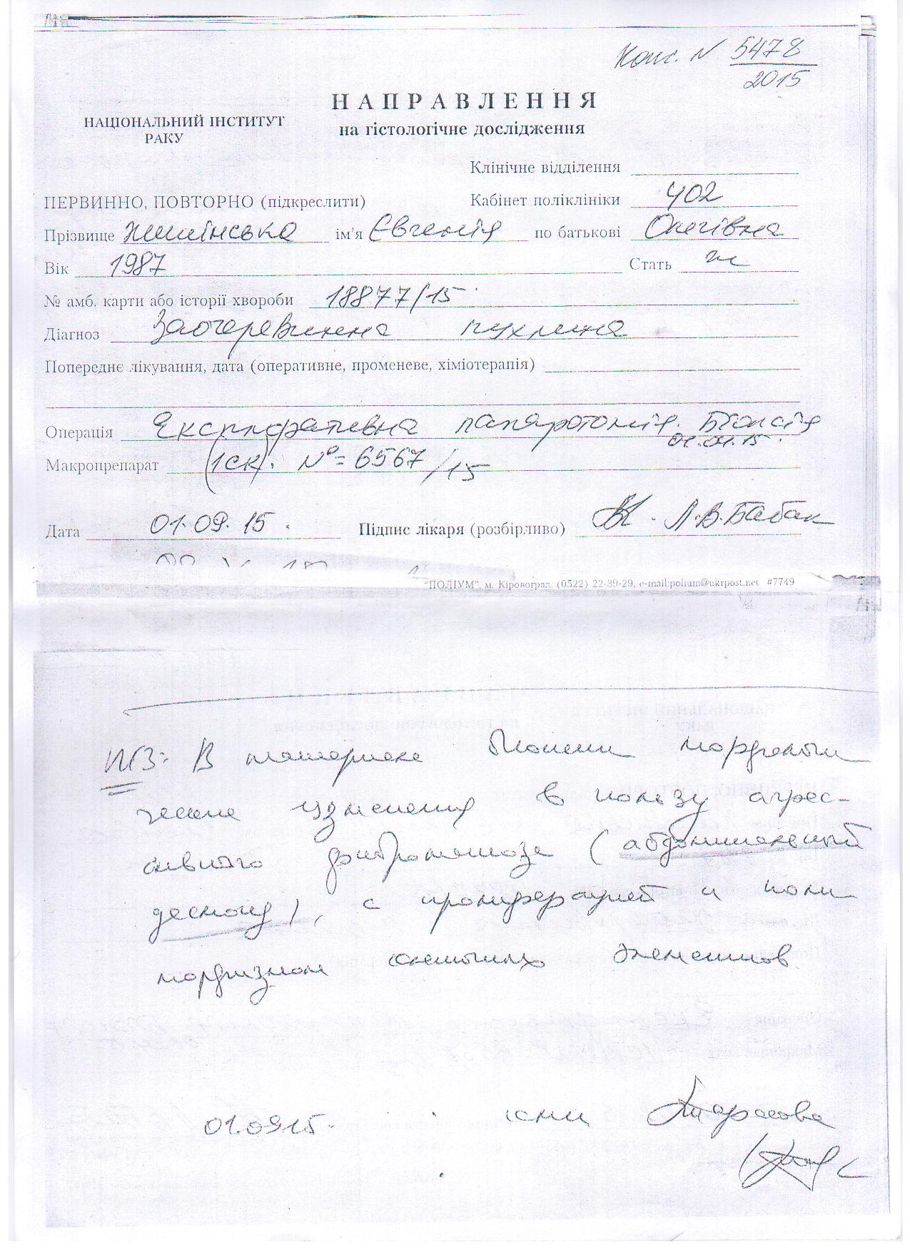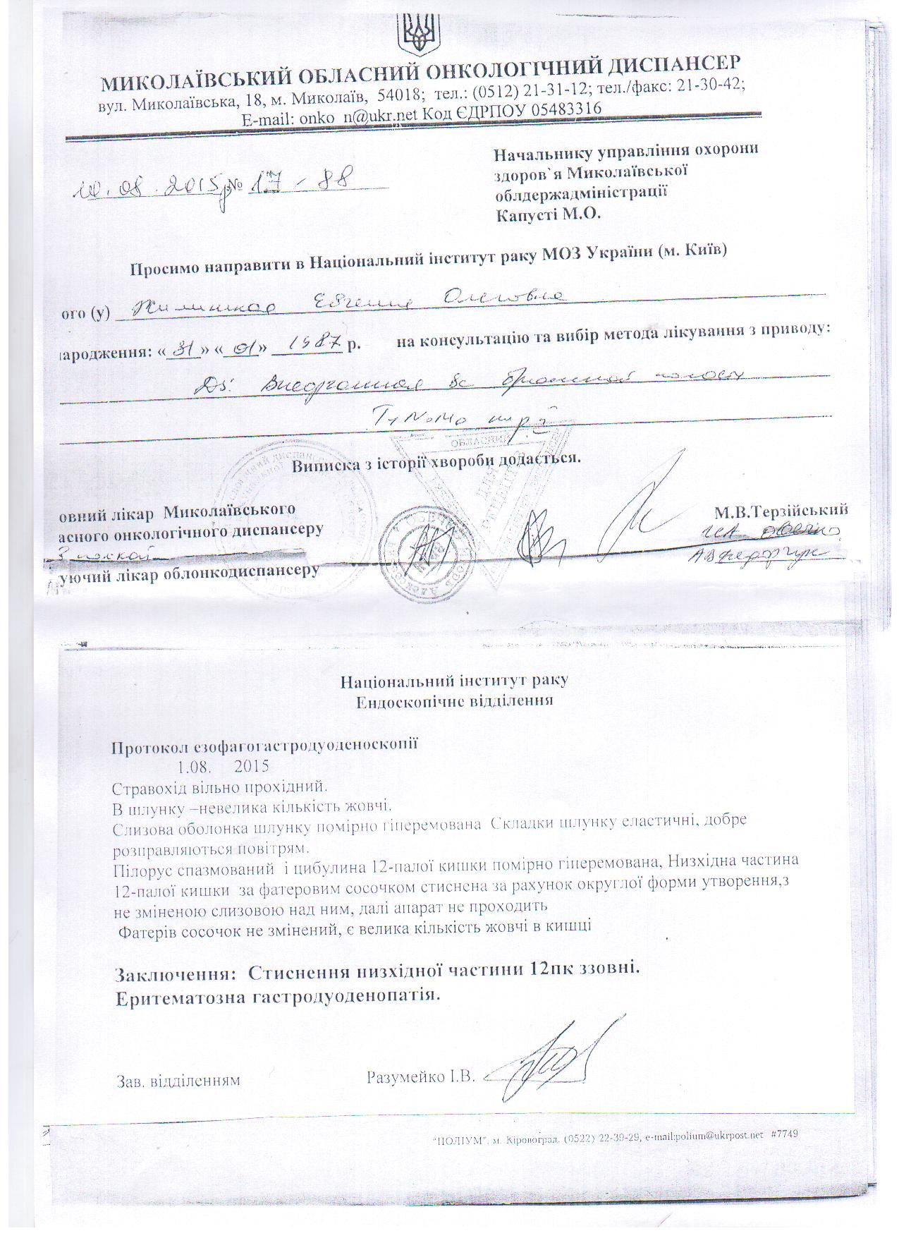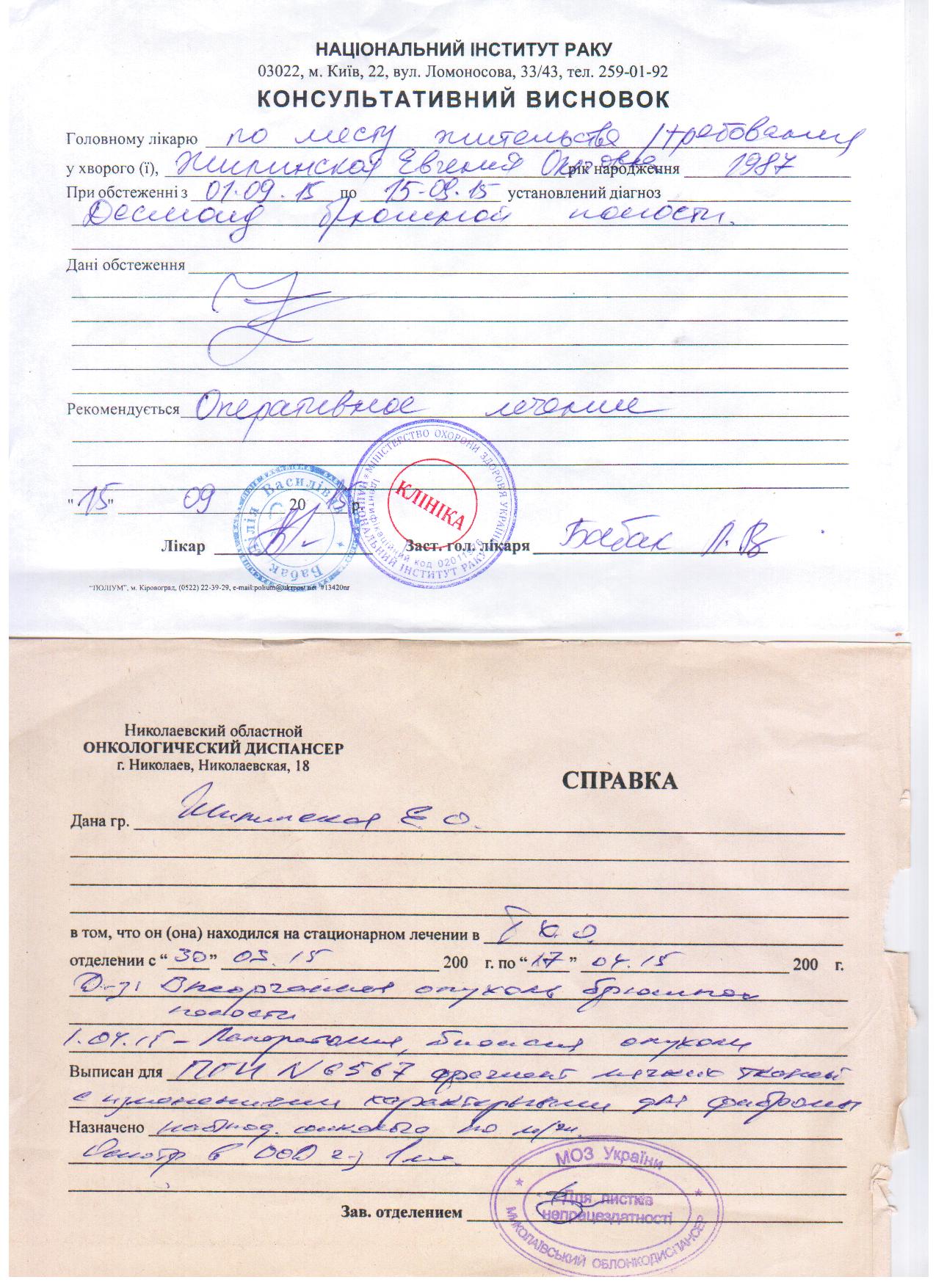 Дальше - еще хуже. Женя позвонила киевскому врачу-онкохирургу в институт рака и попросила поставить ее в очередь на операцию. Но тот вдруг ее огорошил: "Извините, но мы вам ничем помочь не сможем". По новой версии медика выходило, что ей необходима очень сложная операция, и делать такие в Украине никто не берется. Можно, конечно, пройти лучевую или химиотерапию, но и в этом случае положительного результата никто не гарантирует.