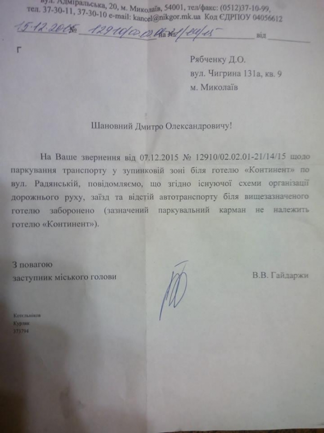 Заместитель городского головы Николаева Валентин Гайдаржи в ответе на информационный запрос общественного активиста Дмитрия Рябченко указал, что парковка возле гостиницы «Континент» является незаконной.