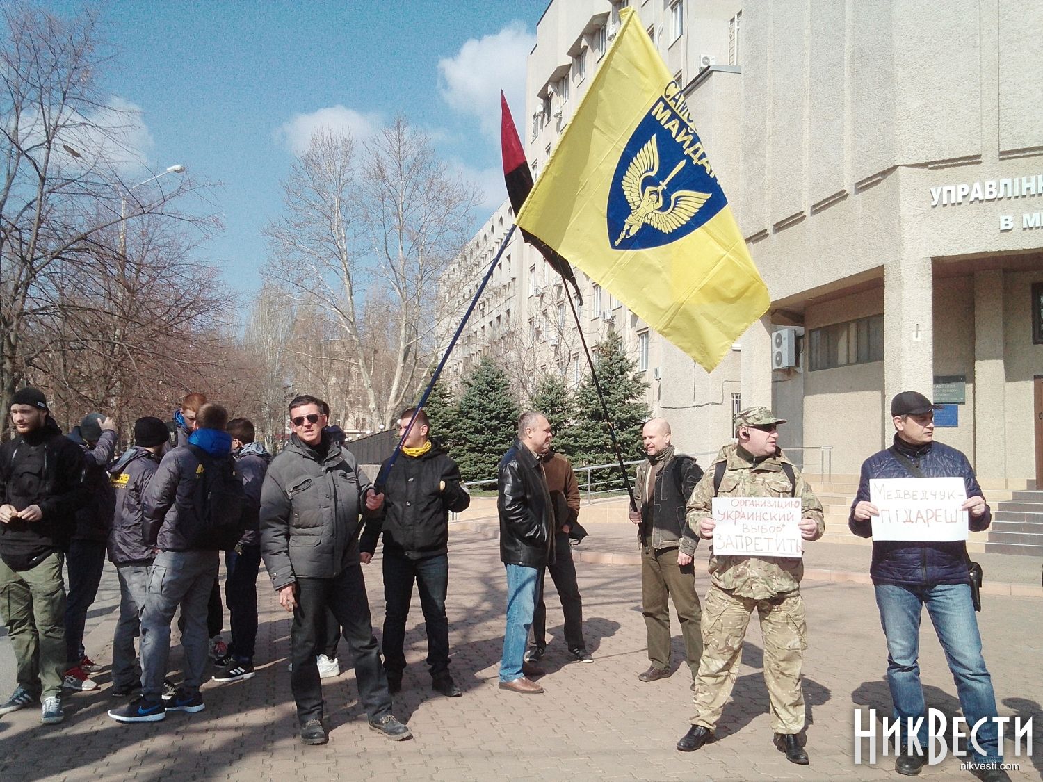 Сегодня, 22 марта, под стенами Управления СБУ в Николаевской области состоялся митинг – около 30 человек требовали прекратить деятельность организации «Украинский выбор» и арестовать бывшего главу Администрации президента при Леониде Кучме, кума президента РФ Владимира Путина, Виктора Медведчука.