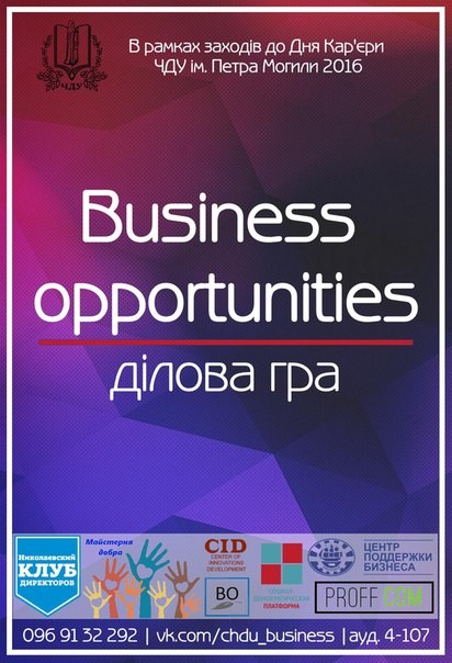 В прошлом году факультет Экономических наук ЧГУ им. Петра Могилы предложил и провел занимательное профориентационное мероприятие для школьников в виде деловой игры по генерации бизнес-идей под названием «Business Opportunitites». Сама игра была разработана и внедрена кандидатом экономический наук, преподавателем факультета Экономических наук университета Матушко А.Е.
