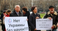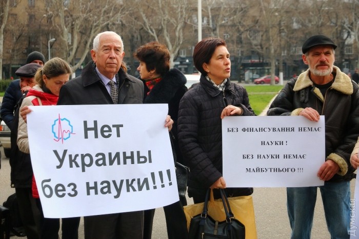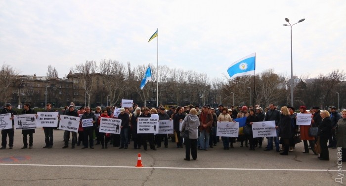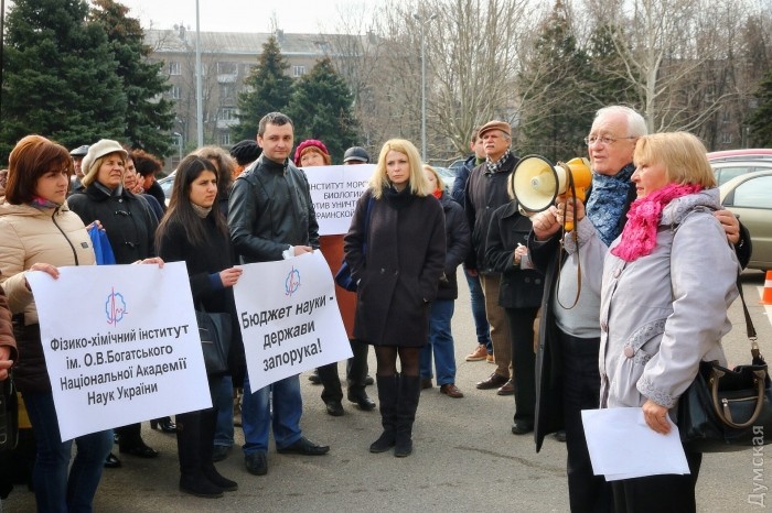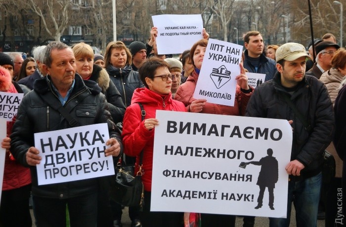 Сегодня утром ученые Южного научного центра Национальной академии наук Украины из Одессы и Николаева вышли на предупредительный пикет под стены Одесской областной государственной администрации.