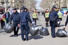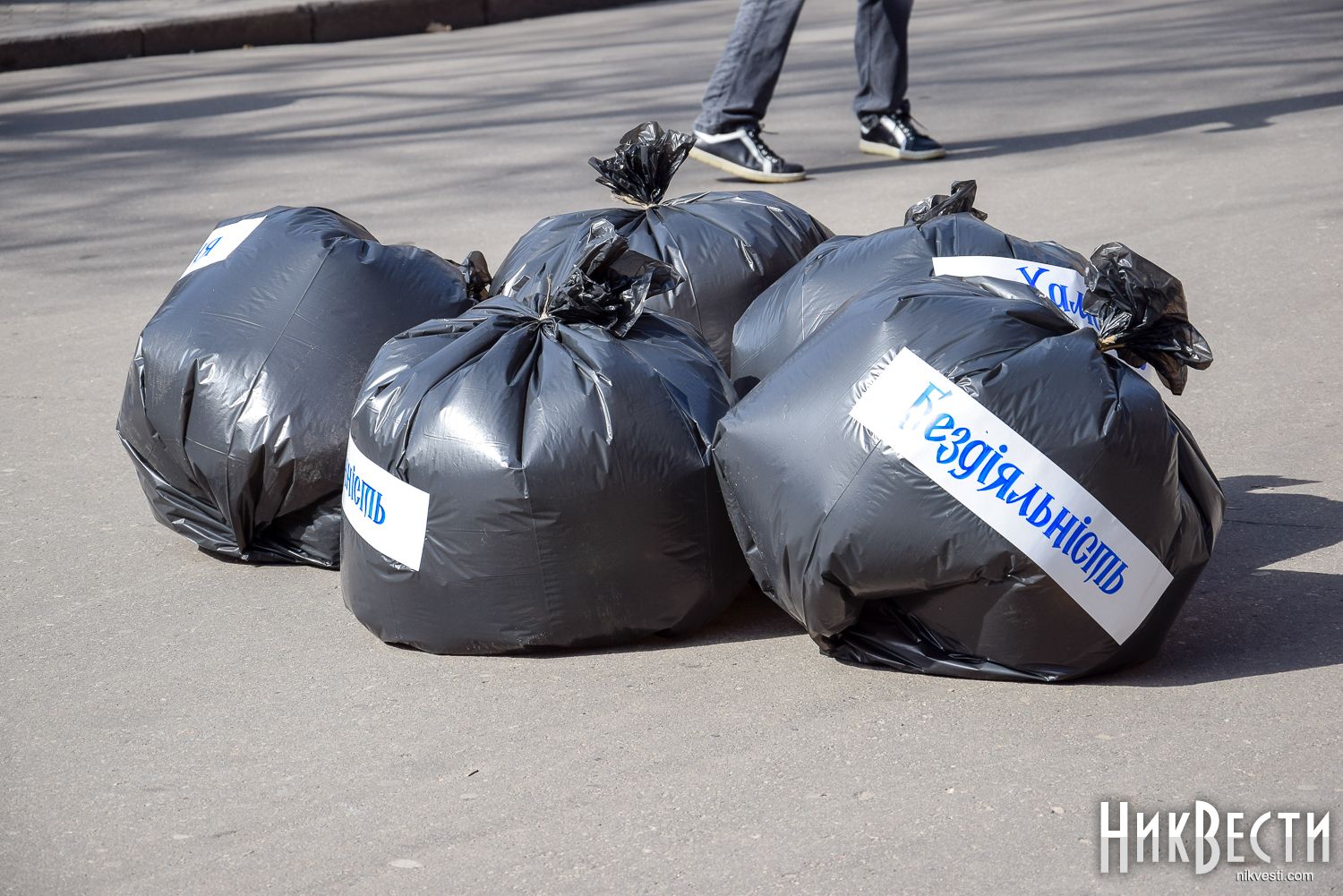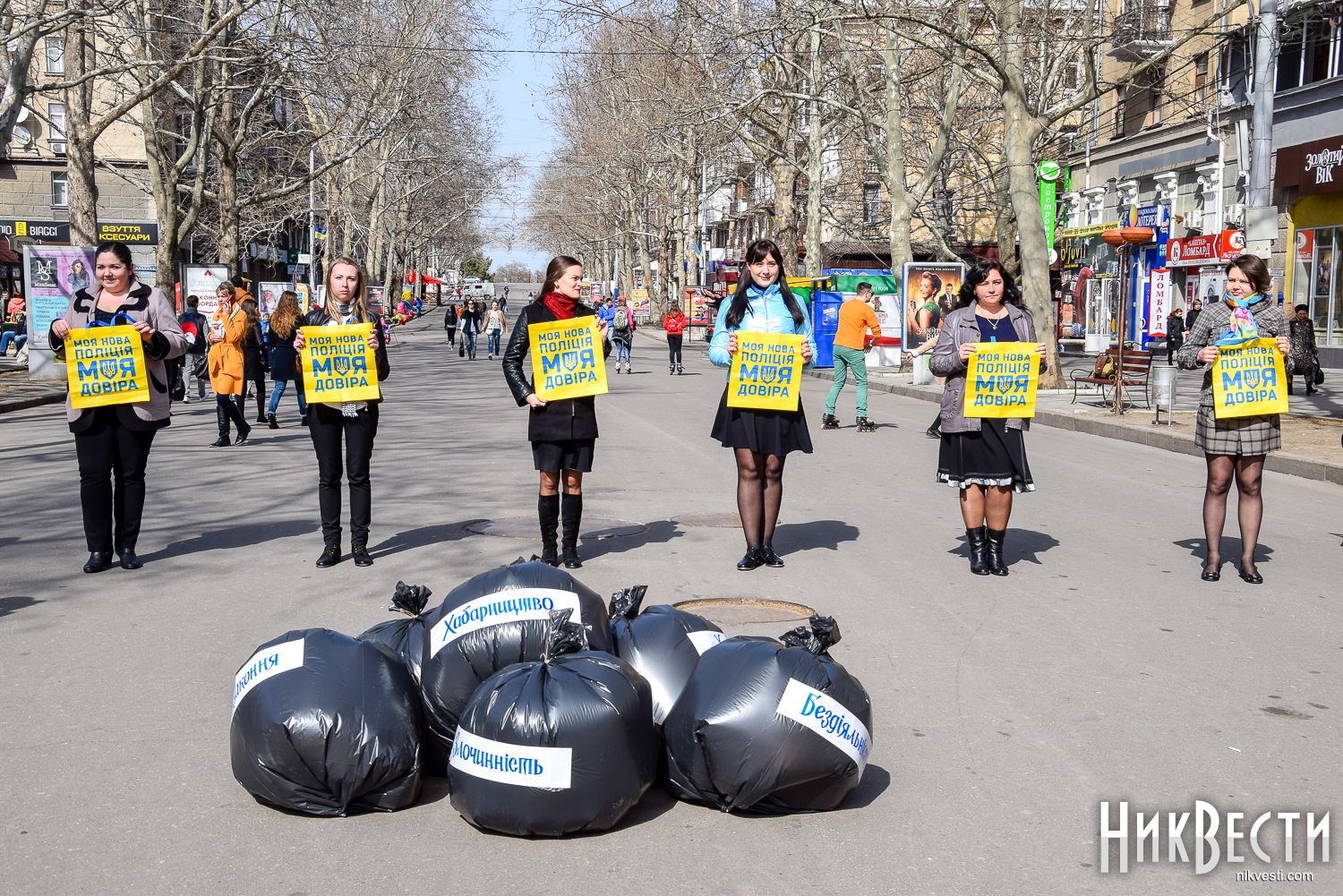 На середину Соборной вынесли большие мусорные мешки с наклейками «беззаконие», «коррупция», «преступность», «хамство». А затем полиция вместе с горожанами символически их «убрала» с улиц города.